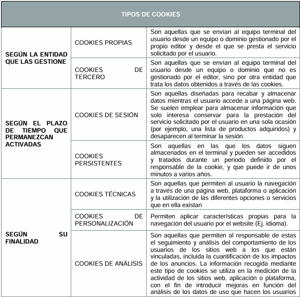 Téngase en cuenta que, si acepta las cookies de terceros, deberá eliminarlas desde las opciones del navegador o desde el sistema ofrecido por el propio tercero.